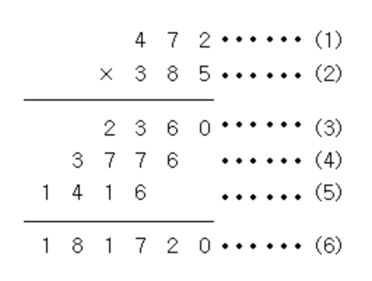 다음의 곱셈에서 (3), (4), (5), (6) 에 들어갈 값을 출력하는 프로그램을 만드는 문제입니다.