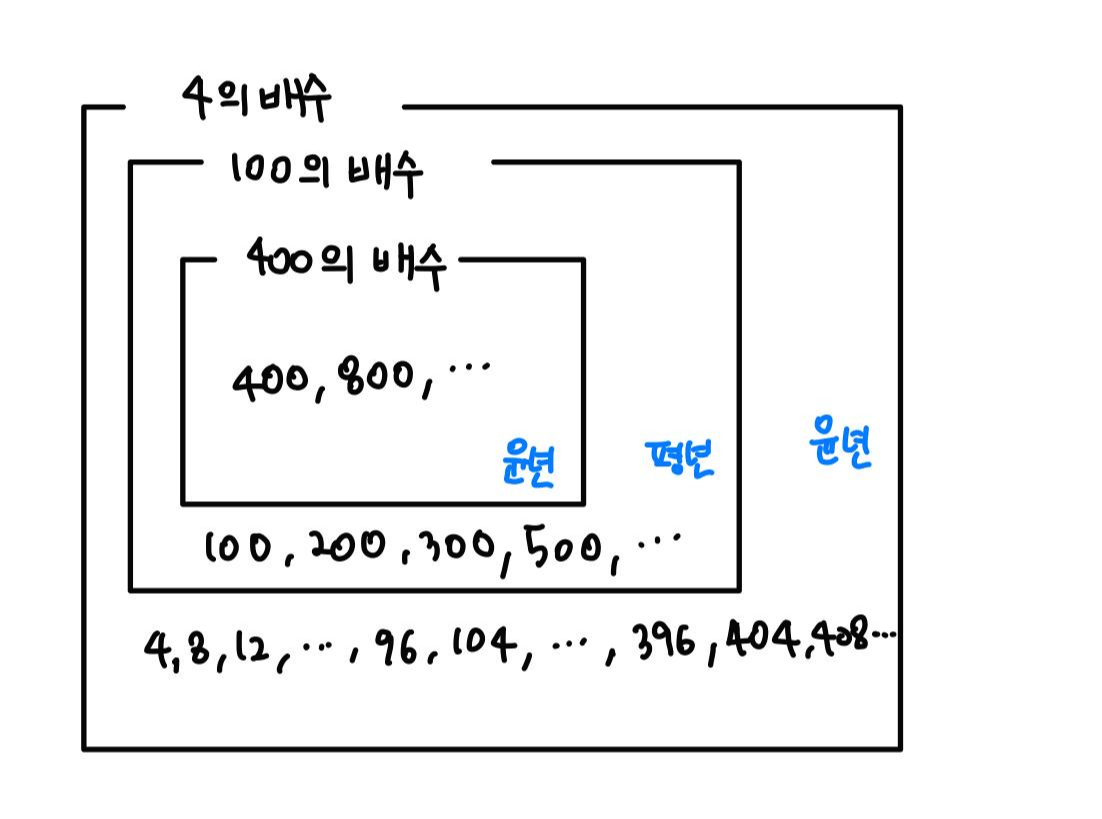 윤년은 연도가 4의 배수이면서, 100의 배수가 아닐 때 또는 400의 배수일 때입니다.