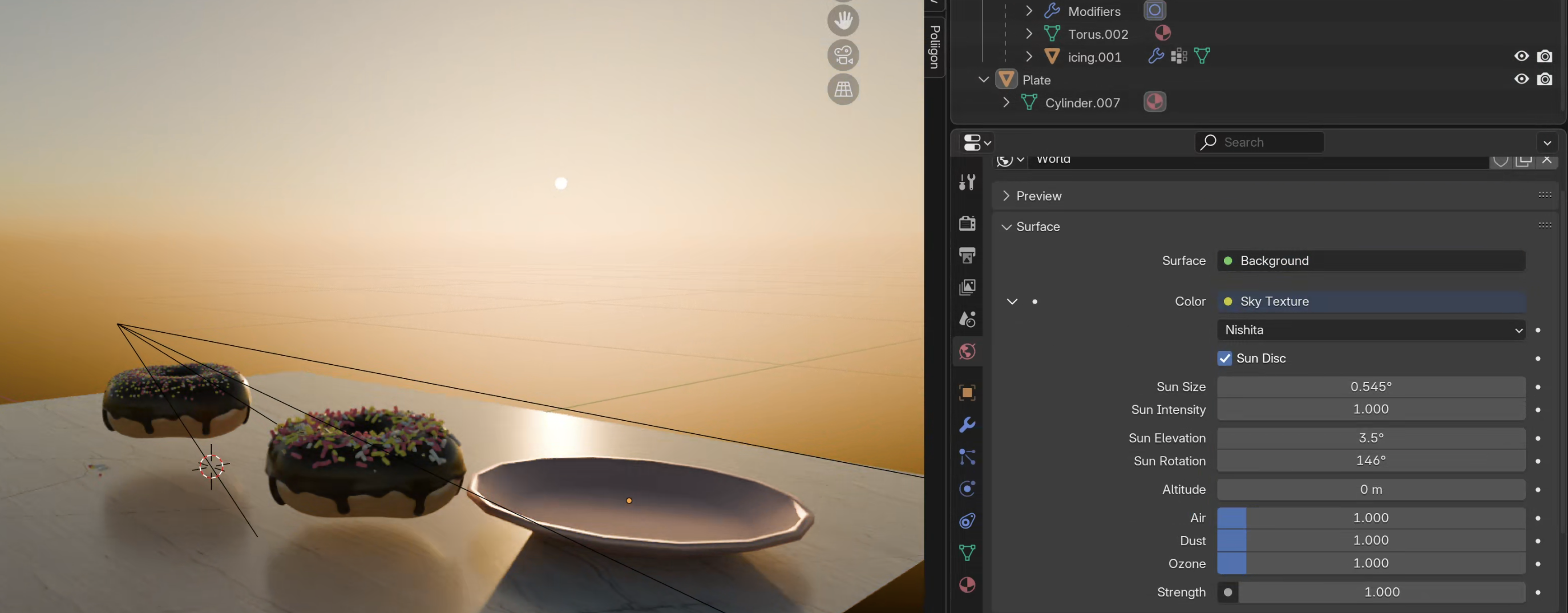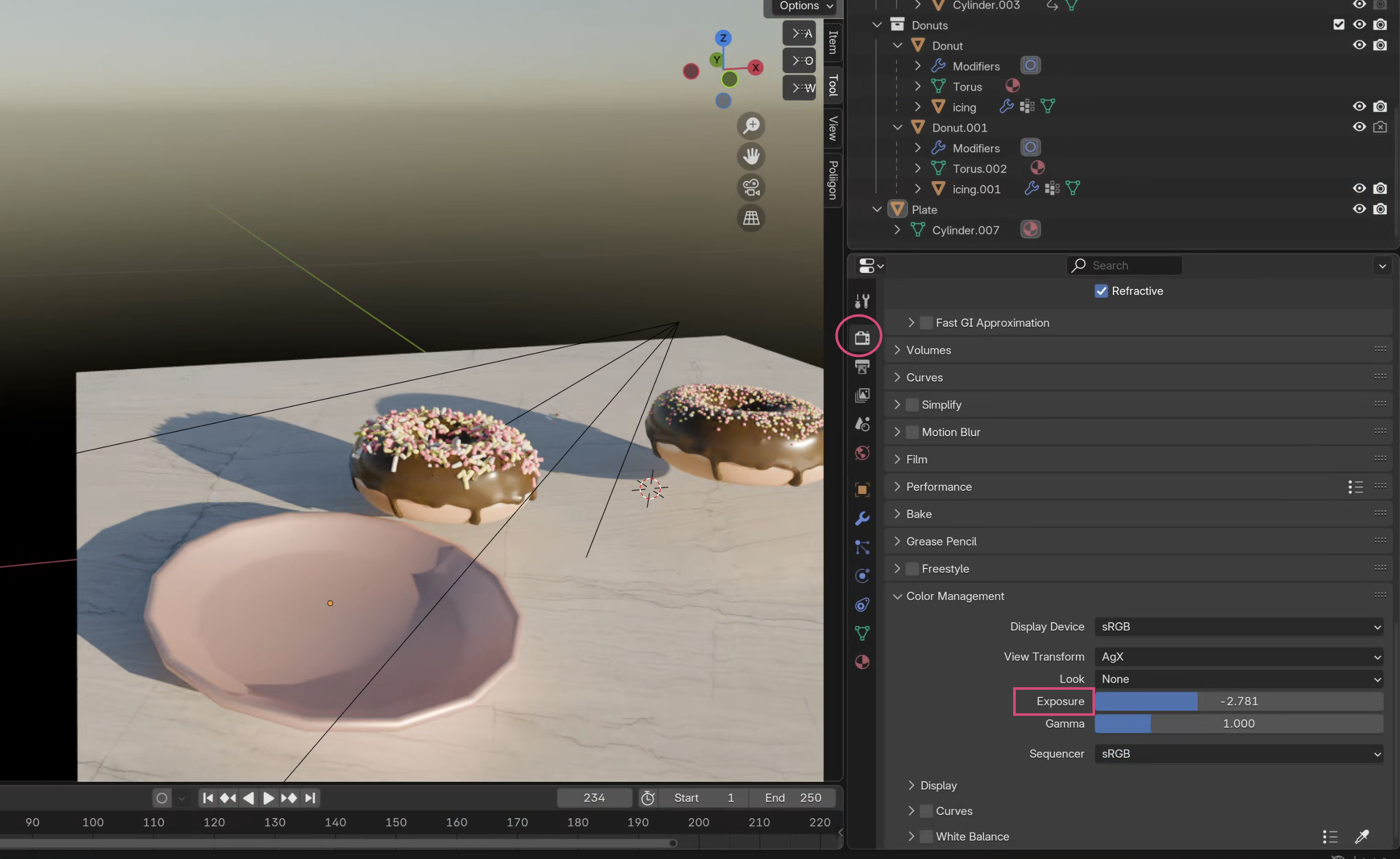 그 후, Render탭의 ColorManagement>Exposure 를 조절해서 태양광의 세기를 원하는대로 맞춰준다.