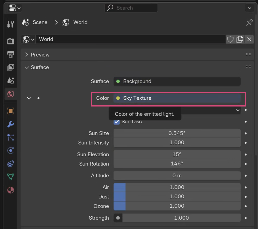 World 탭의 Color에서 SkyTexture를 선택해준다.