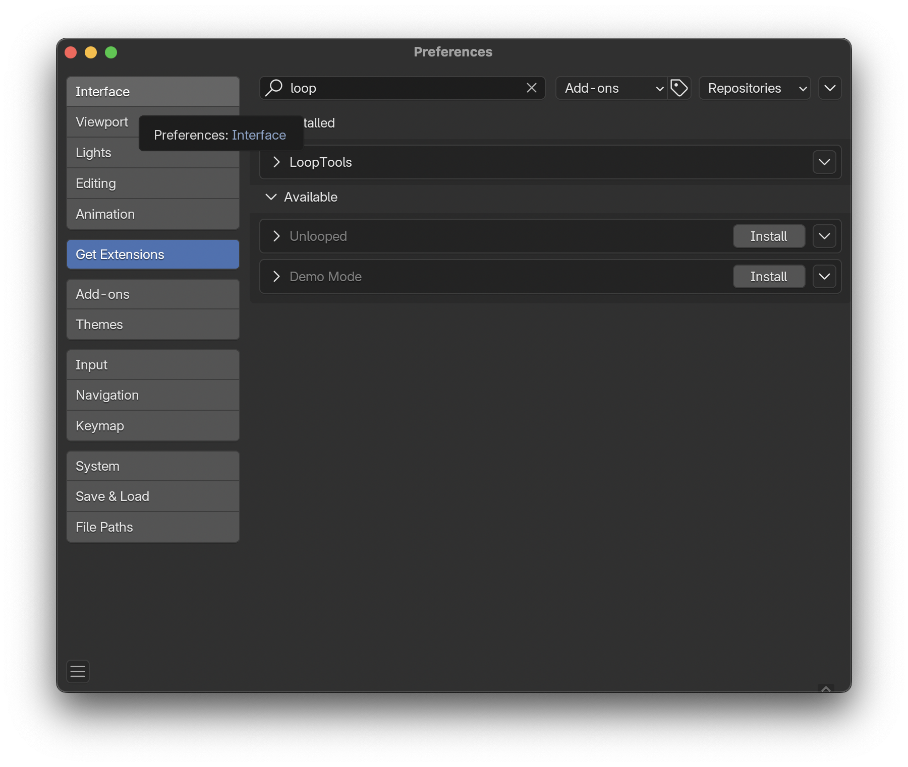 - Edit > Preferences 에서 Get Extensions에 loop 검색