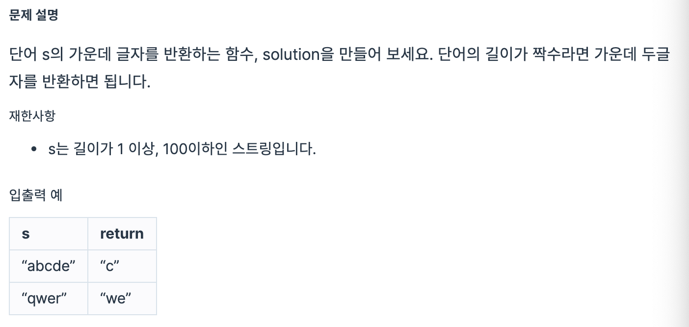 짝수인 경우에는 항상 가운데 두 글자, 홀수인 경우에는 항상 가운데 한 글자가 리턴됩니다.