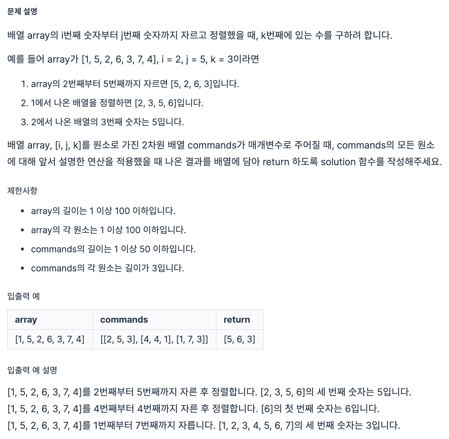 먼저, 문제의 예시인 array = [1,5,2,6,3,7,4], commands = [[2,5,3],[4,4,2],[1,7,3]] 로 생각해봅시다.