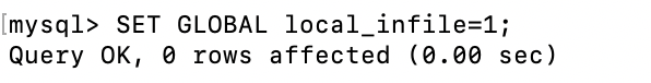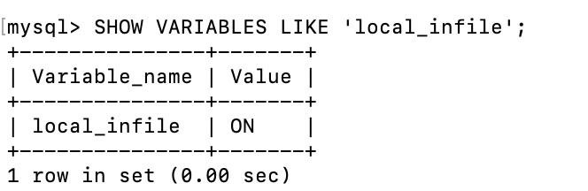 다음 명령어를 쳐서 local_infile 설정을 켜줍니다.