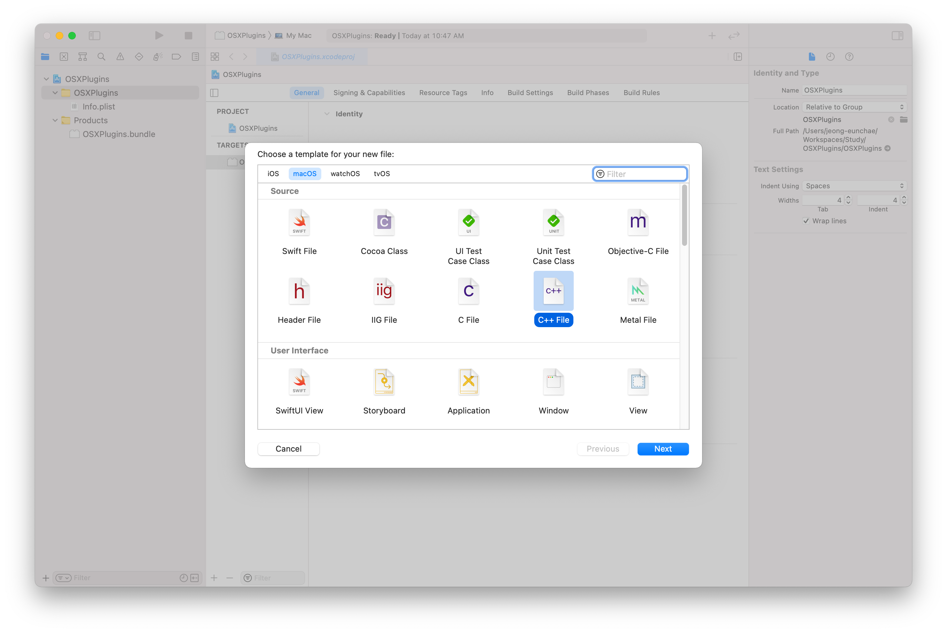OSXPlugins 폴더 선택 후 New File > C++ 파일을 생성한다.