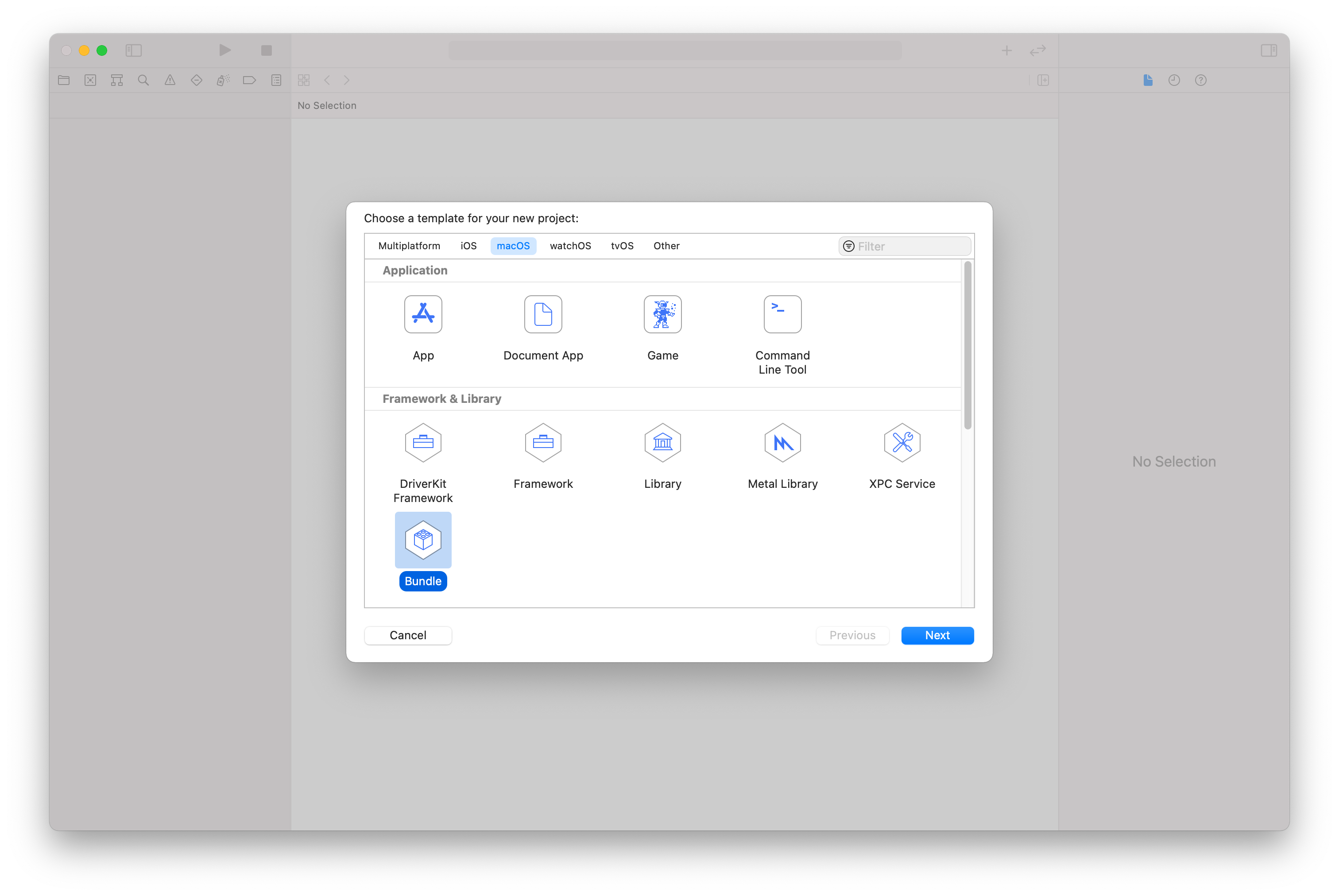 X code를 열어서 New > Project > macOS > Bundle 선택